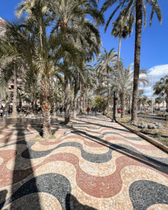 Il mare ci chiama, e quindi subito dopo proseguiamo la nostra passeggiata verso l’Esplanada d’Espanya, il lungomare più emblematico di Alicante, noto per le palme che lo costeggiano e per il suo pavimento a mosaico tricolore (rosso Alicante, crema avorio e nero Marquina) che imita le onde del Mediterraneo con oltre 6 milioni di tessere! Passeggiare sotto il sole caldo, con una leggera brezza che soffia è una sensazione impagabile che ci fa assaporare una primavera anticipata.