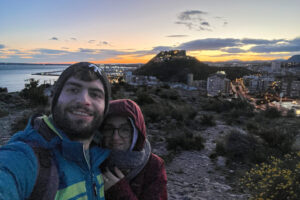 Ebbene, terminato il pranzo è ora di smaltire tutto il chorizo mangiato, quindi la prossima tappa prevede di recarci sulla Serra Grossa, un parco forestale posto vicino alla città di Alicante e situato su un’altura rocciosa alta 173 metri, dove si trovano diversi punti panoramici sulla città. Scegliamo il Mirador della Sanguina, e dopo appena una quindicina di minuti di salita, arriviamo sulla sommità dell’altura, da dove la vista è veramente spettacolare. Lì attendiamo il tramonto, purtroppo sotto una vera e propria bufera di vento che ci costringe a ripararci tra i cespugli per poter resistere tutte quelle ore. Per fortuna però ne vale la pena: il sole fa finalmente capolino tra le nuvole, e il tramonto è uno spettacolo incantevole e iconico con il castello di Santa Barbara in primo piano. Infreddoliti e affamati, attendiamo che si accendano le prime luci della sera e poi iniziamo a scendere in direzione del centro storico, dove la serata si conclude con una gustosa cenetta a base di cotolette farcite (una delizia!) e boccali di tinto de verano in una delle birrerie più iconiche di Alicante.
